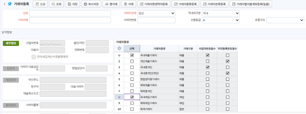 정의된 거래처 종류를 선택하여, 매출/매입/일반의 속성을 가질 수 있도록 관리합니다. 일반적으로 거래처 종류는 매출/매입 여부, 국내/해외 거래처 여부, 사업자등록번호 필수 여부, 개인고객 여부 의 기준으로 정의합니다.
